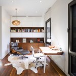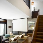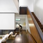 The expansion respects the home’s previous shape and footprint, as most of the additional square footage is on the second floor. The interiors, old and new alike, are open, fluid, and well-lit. The project team located the primary living areas toward the rear of the property, where floor-to-ceiling windows offer views of nearby trees, a rising ravine wall, and a newly constructed ipe wood deck. New finishes include walnut floors and teak and cherry millwork, contrasted by white walls with dark steel plate accents. The home’s original white brick cladding is preserved on the exterior, and blends well with the concrete blocks, cement board, and mahogany-stained plywood additions.