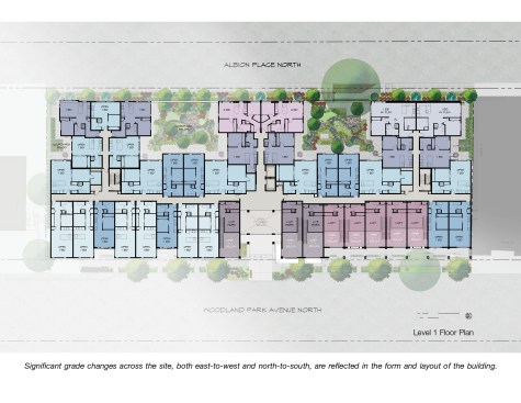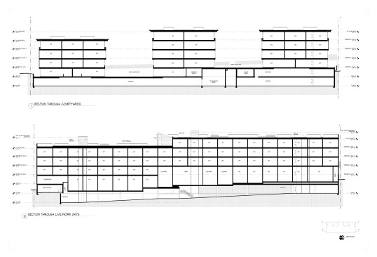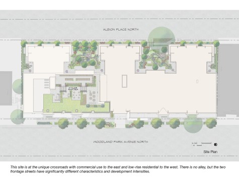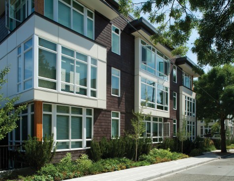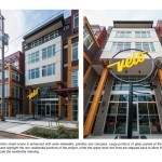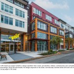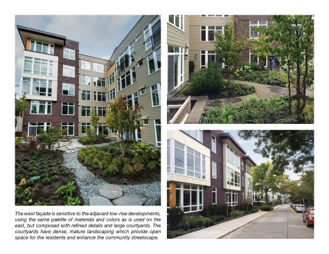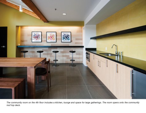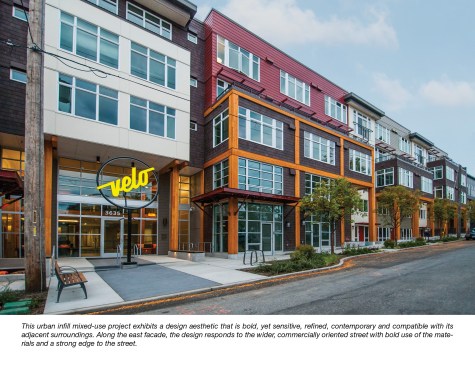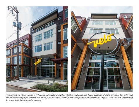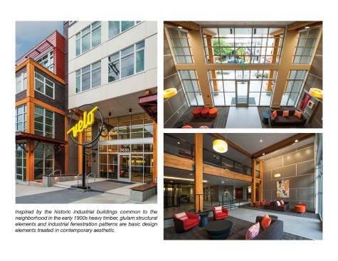 Velo is nestled in the middle of a rapidly transitioning neighborhood – industrial and commercial uses evolving into multifamily and mixed use structures, wrapped by single family and low rise homes. The project sits at the crossroads of commercial use to the east and low-rise residential to the west. There is no alley, but two frontage streets each with significantly different characteristics and development intensities. Significant grade changes across the site, both east-to-west and north-to-south, are reflected in the form and layout of the building. Responding to the topography, the building’s form follows the grade and responds to the pedestrian scale though architectural detailing and materials. The exterior design was inspired by historic industrial buildings common to the neighborhood in the early 1900s. Heavy timber, glulam structural elements with shingle siding and industrial fenestration patterns are basic elements of the design treated in a contemporary aesthetic. Along the east facade, the design responds to a commercially oriented street with bold use of the materials and a strong edge to the street. The west façade is sensitive to the adjacent low-rise developments with refined details and large courtyards to break the massing. The courtyards represent approximately 40% of the pedestrian frontage where the building is held back more than 40’ from the frontage sidewalk. Eyebrow roof lines and bay projections along the west enhance the residential nature of this street. Dense, mature landscaping in the courtyards and roof top deck create open spaces for the residents while enhancing the community streetscape. The interior units have abundant natural light due to the window size and the depth of the unit, creating highly desirable living environments for the tenants. Velo is an urban infill mixed-use project that exhibits a design aesthetic that is bold, yet sensitive, refined, contemporary and compatible with its adjacent surroundings.