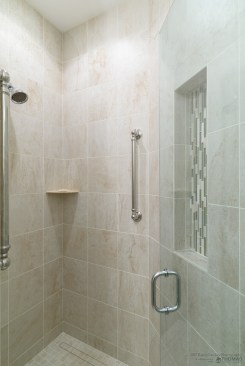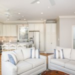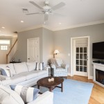 Once these challenges were met, we got to work designing the interior. On the first floor the kitchen, dining room, and living room blend together into one large cohesive space. The open-floor plan provides an abundance of sunlight, promotes greater traffic flow and gives the illusion of more space. Oak flooring throughout unifies these common areas. Traditional white cabinetry, grey granite countertops, neutral paint and French doors make the space feel bright and airy.