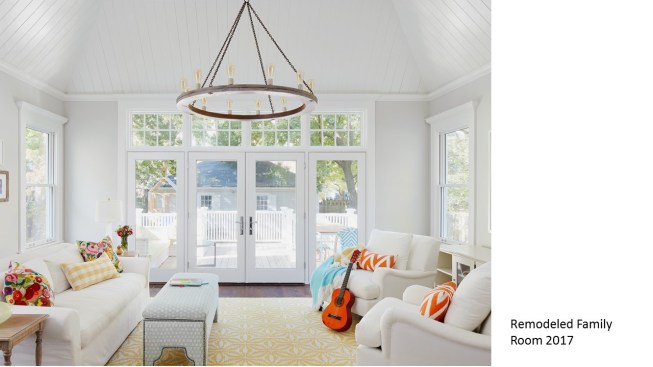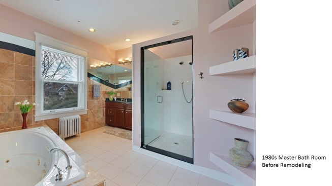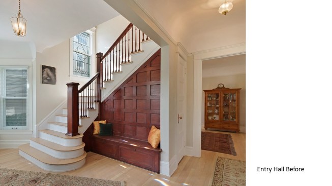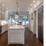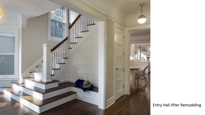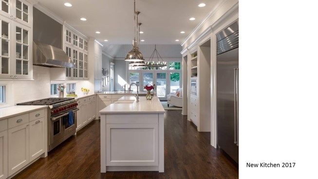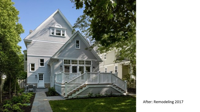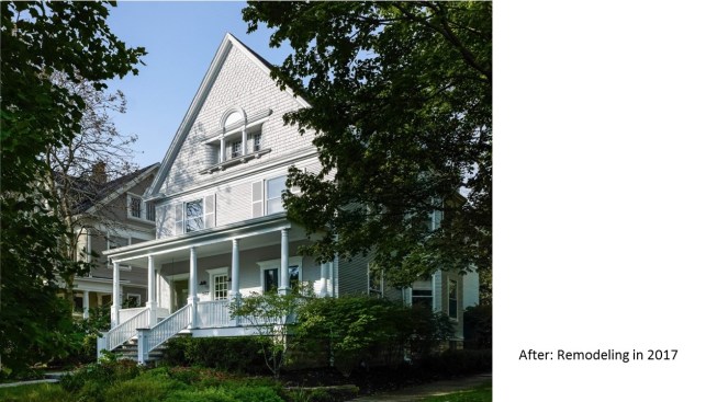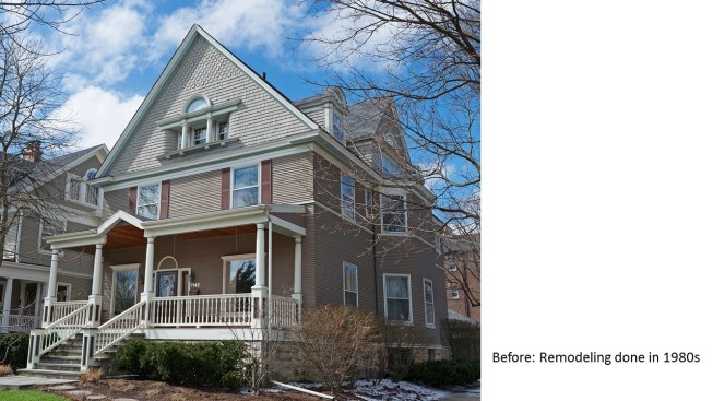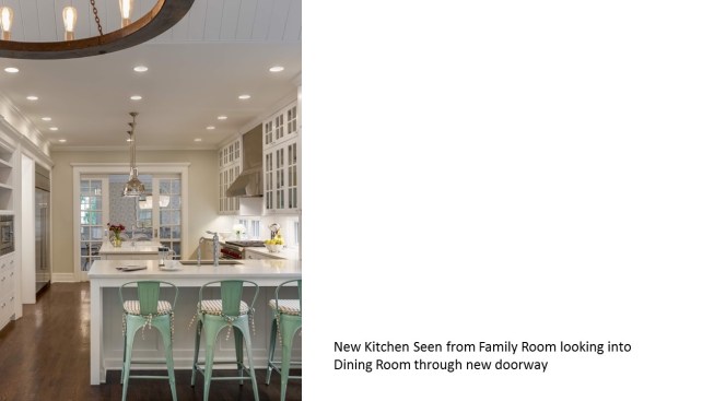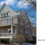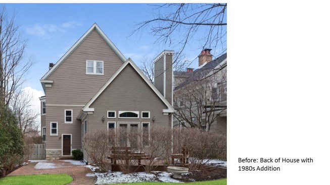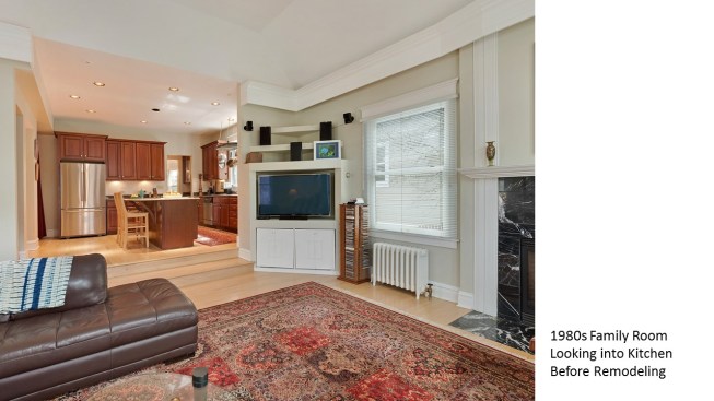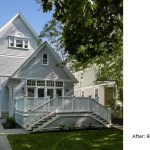 Remodeled in the 1980s (postmodern) this 1890s Victorian house, located in a historic district, had its front porch entirely rebuilt and a one story addition made to the back of the house. The 1980s addition included a new family room with two steps into the addition. At this time the Living Room and front parlor were combined into a single large awkward space and a second floor master suite was created. The project was to remodel the house for a young couple with two small children; to create an up to date kitchen and bathrooms that would be sympathetic to the period of the house; and to restore the exteriors to make them compatible with the original architectural elements of the Victorian House; and to open and interconnect the ground floor living areas. The one story family room addition was altered with new windows, doors, and exterior trim related to the original house. The family room floor level was raised to that of the kitchen to eliminate the two steps which the client felt were a tripping danger for their small children. Inside, the front parlor was recreated and the metal prefab fireplace that had been added in the corner of the living room was removed. The opening between the living room and the existing dining room was enlarged. The 1980s butler's pantry and the powder room were relocated. This allowed the kitchen to open directly to the dining room on one side and to the remodeled family room on the other, providing views through the house from front to back. On the second floor the master suite was reconfigured and the all the bathrooms were redone.
