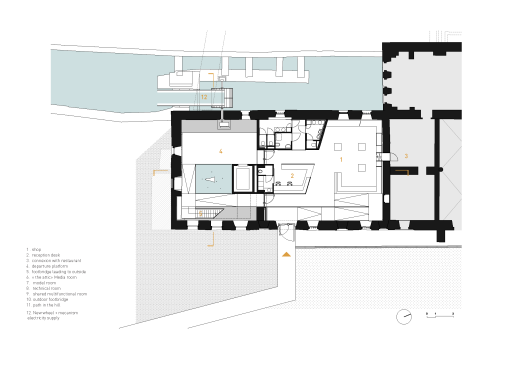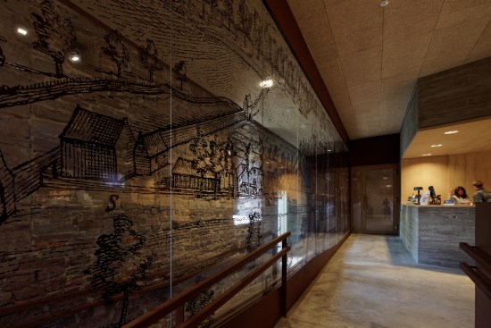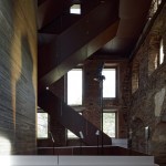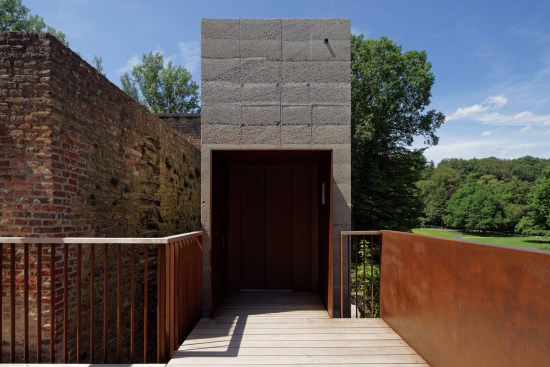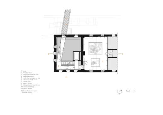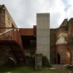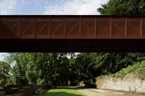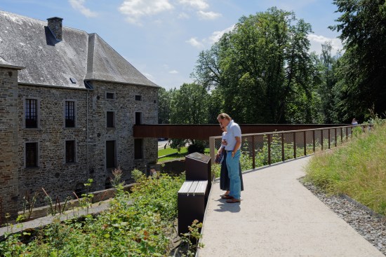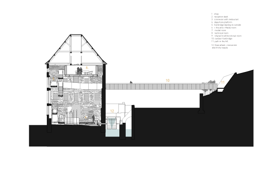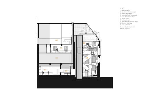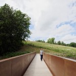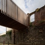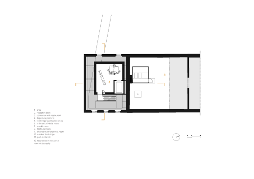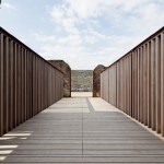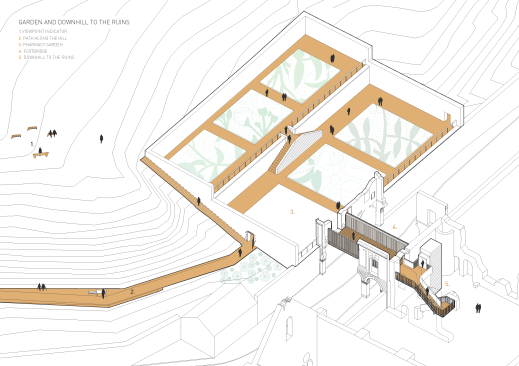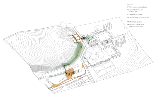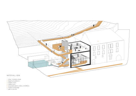 The Villers-La-ville abbey site is crossed and split by the N275 national road so it looses logic and unity. Architecture, through a common intervention in landscape and scenography fields, try to reunite the full cistercian composition plan. The project leads to a truly sequence from the parking to the ruins and prepares the visitors. The new path goes by the mill (reception hall, scenographic spaces, models room), reaches the hill across the new footbridge, continues through the garden, crosses the second bridge over the national road and finally goes down into the ruins. The project highlights a common thread by means of sober materials (corten, wood, concrete) set up in various ways.