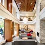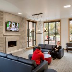 The common area spaces feature furniture for different types of activity, such as meeting, gathering and studying, and styles include durable yet comfortable furniture with a clean modern aesthetic. A mixture of high and low pieces includes modular furniture to encourage one-on-one and group socializing. A moveable media wall in the Living Room provides flexibility for different activities within the space, and a two-story light-colored limestone fireplace anchors the surrounding open space.