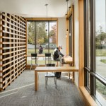 The interior finish palette consists of natural “changing of the season” hues, inspired by the building’s connection to the arboretum. Each level is identified with a different accent color, and the wood trim on walls and ceilings creates a warm and welcoming entry. Organic patterns are present in the carpet and wood-grained porcelain tile on the first floor and garden-level floors. The lighting is soft and warm, creating a comforting, home-like ambiance.