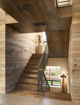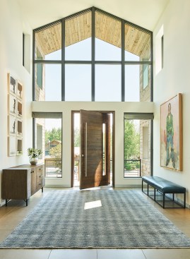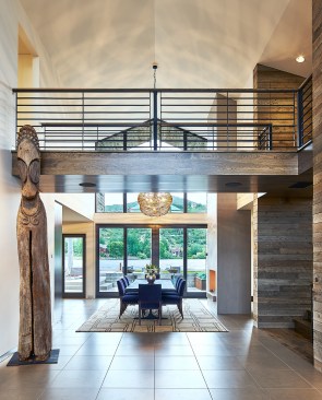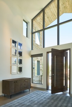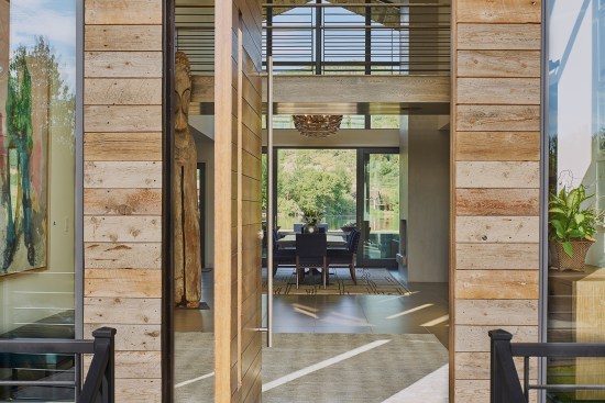 A unique lakeside setting informs the design of this ground-up, single-family home. Respectful of the neighborhood, iconic, shifting gable forms are arranged to maximize seamless front-to-back lake views, as well as to enhance non-lake-facing views and allow for open living spaces. A central spine provides further connection from the entry to the lake. A double-height gallery serves as space for the owners’ extensive contemporary art collection. Primary materials and exterior finishes reflect the mountain vernacular architecture detailed in a more modern way.