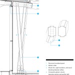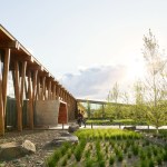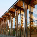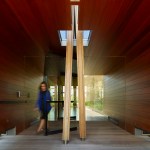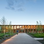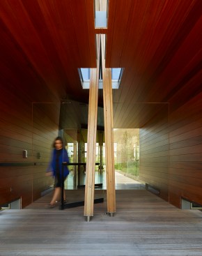 A notch through the berm provides access from the parking area to the formal courtyard and building entrance. Crossing the courtyard via a boardwalk, the visitor is embraced by a fully-glazed facade, punctuated by a series of wood columns that march across the building in regular intervals. The boardwalk aligns with an off-set building entry, which is formed as a wood-wrapped passageway inserted into the glazed facade.