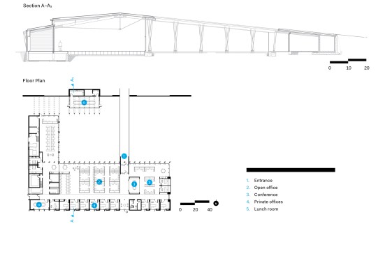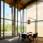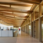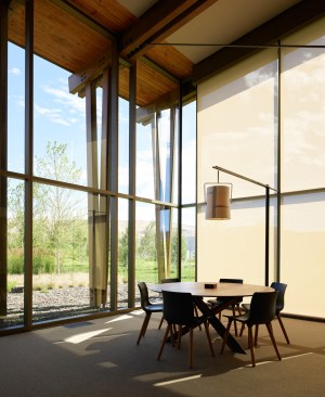 Spartan, daylight-filled interiors are complemented by a warm, simple palette of natural materials. Private offices line the south wall, while conference spaces and back-of-house functions are set in wood-clad boxes. Interior furnishings terminate well below the ceiling. The open feeling of the structure is reinforced by keeping furnishings low and allowing them to float within the space. Lighting consists of custom-designed uplights, which keep the ceiling plane tidy. A raised flooring system further ensures that the clean aesthetic is preserved and free of cabling. The deep agricultural roots of both the company and location underlie the simple design concept and attention to detail throughout the project.