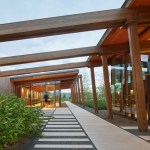The L-shaped building is nested into the landscape through the use of board-formed concrete site walls and earthen berms that wrap the perimeter to form a central, landscaped courtyard. Soil excavated for foundation work was repurposed for the perimeter berms, eliminating the need to remove it or add more.