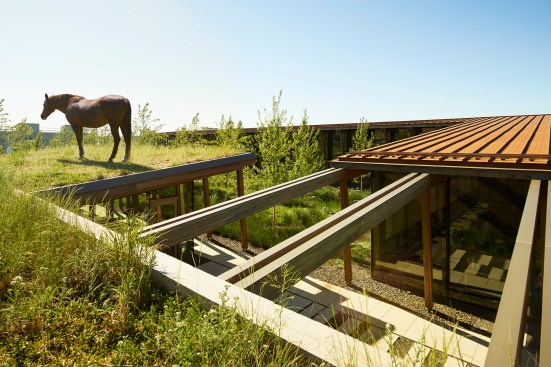 A structural exoskeleton of laminated wood buttresses removes the need for any interior supports, simultaneously establishing a steady rhythm around the perimeter of the horseshoe-shaped, one-story groundscraper and allowing for a column-free interior. That 16,500-square-foot space, faced in floor-to-ceiling glass, looks on one side onto a courtyard with plantings and paths, and on the other to a sweeping view across the countryside. A berm on the edge of the site cleverly obscures a nearby highway so that nothing disturbs the bucolic scene. There’s even a portion of an aging barn on site—just a little reminder of the area’s picturesque past.