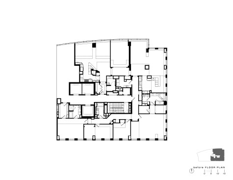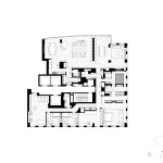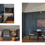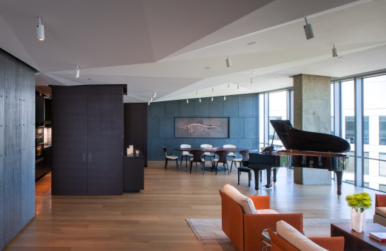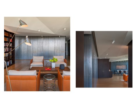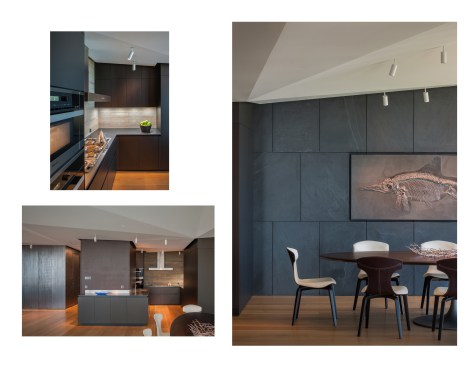 “The floating, folded plane never engages the walls, columns, or millwork components,” Gurney explains. While intentionally irregular in pattern, it subtly rises as it approaches the window wall, which draws gazes toward the views and reflects daylight into the apartment’s core. A simple, clean selection of elegant materials, including steel, wenge, white oak, and cleft slate, was used for finishes. Their refined character is then juxtaposed in places with the raw and austere—including selective exposition of the base building’s concrete structure.