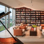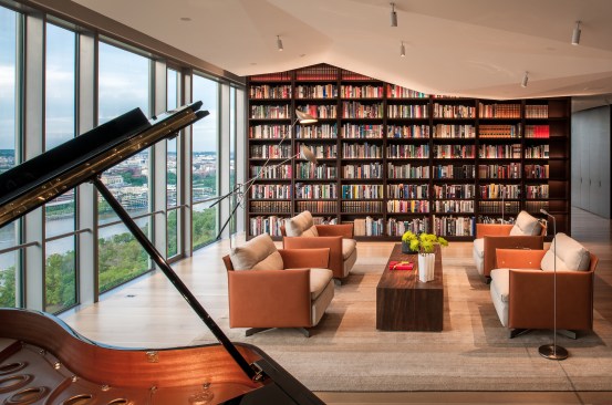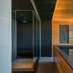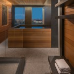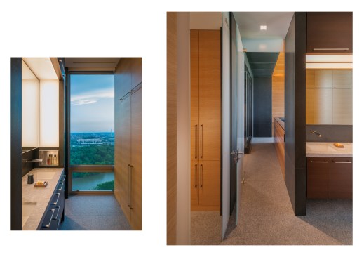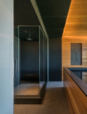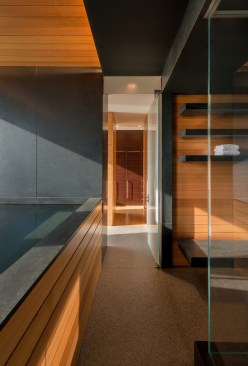 Incorporated into the master suite is a “monastic” spa room, a rather atypical programmatic element that Gurney designed with a large Japanese soaking tub as its centerpiece. Quiet is evoked through a rich mix of materials including absolute black granite with vertical grain Western red cedar walls—creating a harmonious space that feels far away from the stress-filled city in the distance.—E.K.
