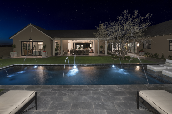 Each of the 50 ranch-style homes in Camelot Homes’ White Horse community is designed to embrace Arizona’s desert environment, with expansive outdoor living spaces and multiple sliding-glass indoor–outdoor connection points. However, since the site sits near a major six-lane thoroughfare, these outdoor spaces had to be protected from the noise of the road.