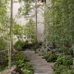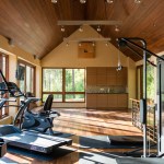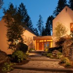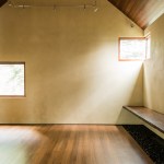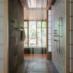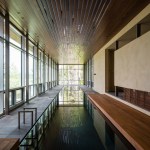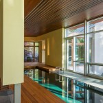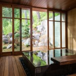 There are two approaches to the building. The guest entry begins well down the hillside, providing a compact yet pleasingly lush and welcoming stone pathway. The more commonly used “hidden pathway” leads from the owner’s main residence through the trees to a private back door entry on the lowest level. Situated in a more private, introspective location within the building, the Japanese Tub opens widely to the meticulously sculpted landscape, blurring the lines between the natural and built environments. The Exercise Room resides alone up a short flight of stairs within steps of a panoramic rooftop garden.