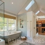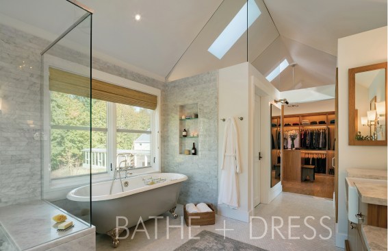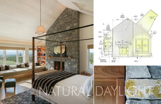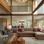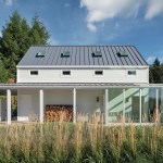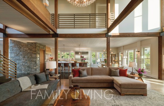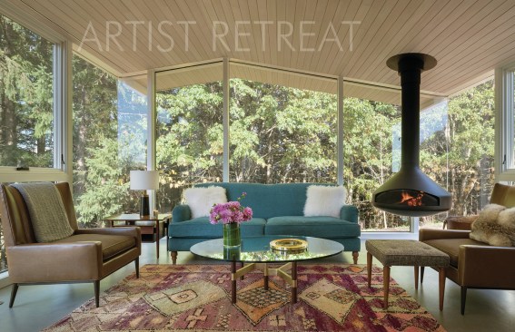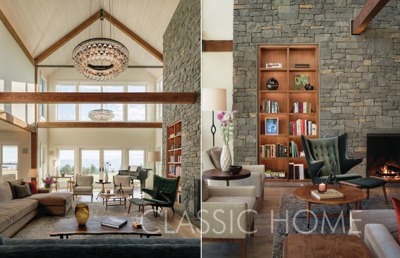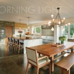 Strategically placed windows and skylights are positioned to stream in sunlight even during winter months. Outside, a pool, sauna, spa, fireside seating, and eating area complete the indoor–outdoor living experience. A traditional wrap-around porch envelopes the Douglas fir-dotted site, and a secluded artist’s studio and retreat offers a respite from the main home. “Rigor and simplicity dictate the design of this home that’s both classic and contemporary, orthodox and original,” says architect Chris Kempel.
