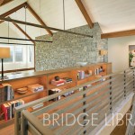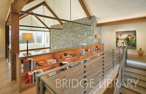 Built by local firm Hammer & Hand, the house combines the three key elements of a farmhouse: a rural location; a functional porch; and a combination of formal and informal spaces. In its double-height, bi-level living room, a stone fireplace marks the central focus, serving as a favored gathering place for the family. The L-shaped plan’s two distinct wings are adjoined by a glass walkway that affords its residents a feeling of interacting with the lush landscape from the comfort of the indoors.