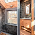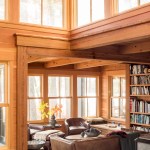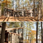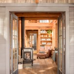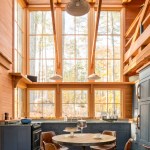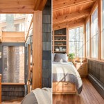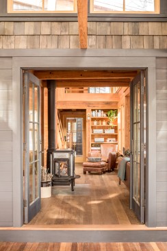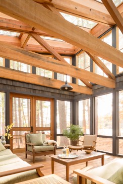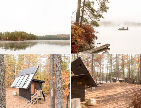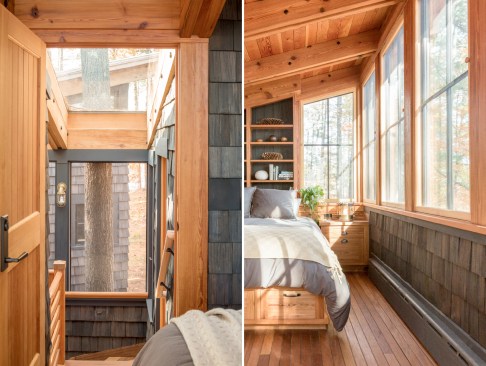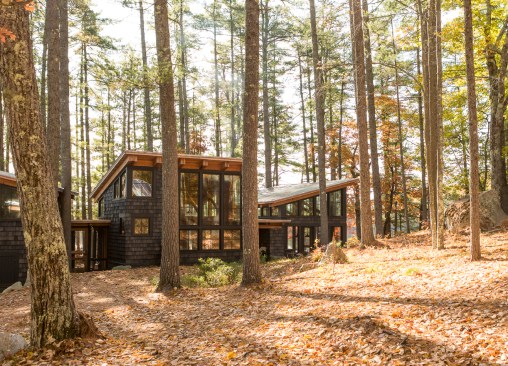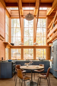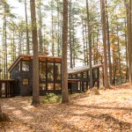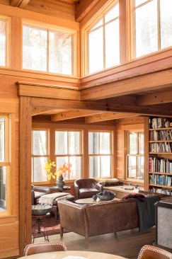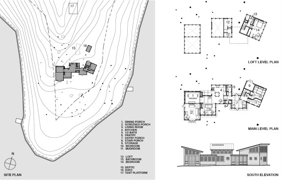 The clients, architects, and builder fell in love with the secluded, heavily wooded island and wanted to craft a design solution that embraced the site. To help achieve this goal the camp is built on piers allowing trees to remain close to the structure, nesting the building into the landscape and giving the sense that the camp has been on the site for many years. Designed primarily for summer living, the camp has a relaxed plan with the entry into a screened porch that blurs the boundaries between the interior and exterior as it allows users to flow through from the water up the hill of the site and links the main living spaces with the bedroom cabin. To further blend into the landscape and open the house to views of the lake, the low pitched shed roofs mimic the surrounding grade of the site that are connected by lower, flatter roofs covered in pine duff. The exterior is clad with hand-split cedar shakes with a semi transparent charcoal stain inspired by the color and texture of the surrounding tree bark. The building is framed with re-sawn antique heart pine rafters. The floors are torrefied oak in the main spaces and garapa decking with torrefied oak spacers between to feel like a boat deck at the porches and stair. In an effort to further blur the boundaries between the interior and exterior the main bathroom has shake siding for walls and the shower is clad with reclaimed slate shingles with a corner window and luminous skylight above, giving the sense of an outdoor shower. Working on a small, private island on a pond provided many opportunities and challenges. The first challenge was how to effectively bring construction equipment and materials out to the island, which resulted in the builder constructing a small barge. Building on piers helped minimize concrete use, as all the concrete was brought over in bags and mixed with a small, antique concrete mixer the builder found. Utilities were another challenge; to meet the needs of the camp a small mechanical shed is located near the highpoint of the island in an existing clearing, sited to maximize sunlight. The roof of the mechanical building has photovoltaic panels and solar hot water panels. The roof rotates with a crank wheel adjusting the slope of the roof to harvest as much sunlight as possible throughout the changing seasons.