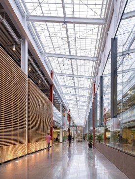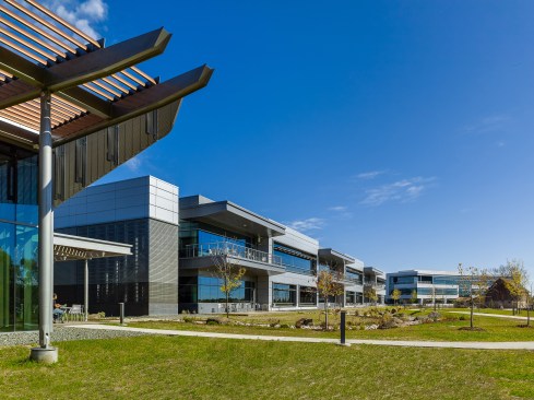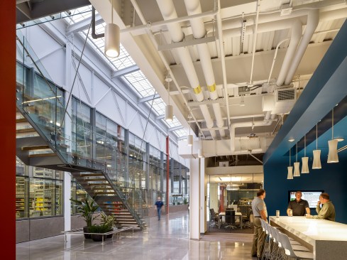Woodward is the world’s oldest and largest independent designer, manufacturer, and service provider of energy control systems for the aerospace and industrial sectors. They wanted to transform a 100-acre site into a campus encompassing a new corporate headquarters and additional manufacturing and support facilities to facilitate their operational growth, attract top talent, and create jobs in the Fort Collins community.They engaged Ghafari Associates to take the first step – developing a cohesive master plan based on a deep understanding of their goals. They then selected us to provide process design, architecture and engineering services for Phase 1, which included a corporate headquarters and a multi-functional turbo-machinery systems building. The dynamic design of these first two structures needed to set the architectural tone of the campus while embracing the client’s brand identity. The industrial turbo-machinery systems building is organized around a multi-level “Main Street” corridor that serves as the spine of the campus. It includes both manufacturing spaces and offices, connected by two structurally suspended staircases. The headquarters building visually anchors the campus on the east and conveniently links back to its engineering and manufacturing components. We adopted an open-concept layout characterized by the generous use of glass and modular spaces that foster collaboration. Our process design and engineering services raised the manufacture of turbo-machinery systems to a higher level of functionality. Our building design, which focused on the consistent use of select building materials and daylighting, created a cohesive look to the campus. In addition, the open concept design of the interior spaces supports interaction and teamwork. The result is a campus that merges the client’s high-tech manufacturing capability with their focus on creative teamwork to help current and future employees do their best.