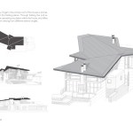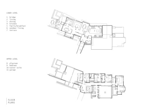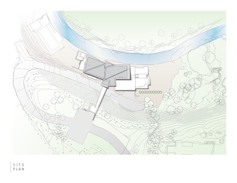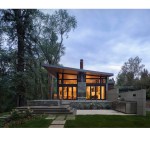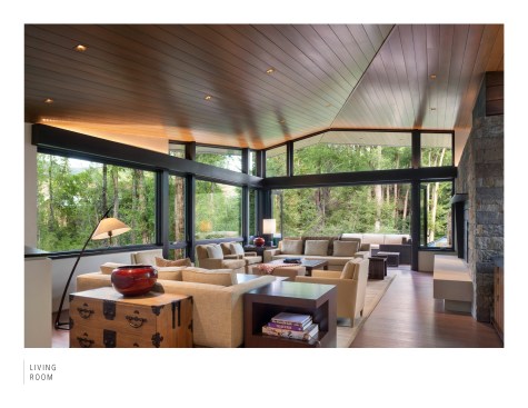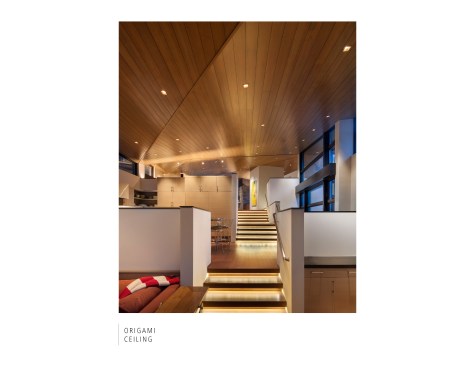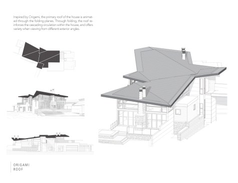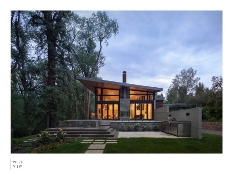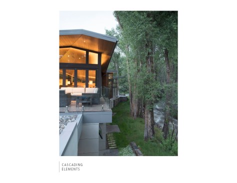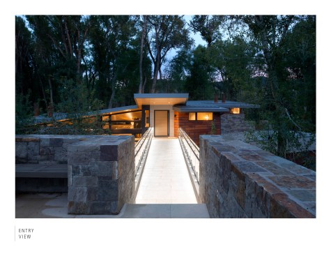 Situated near a creek that flows below a steep embankment, the house sits between an open pasture and a dense Cottonwood grove. The design takes advantage of the naturally stepping site to achieve a low, reserved presence on the land. Upon entering the property, only origami-like folded planes of the roof are seen above a field. A bridge initiates the procession through the house. The bridge moves one from the open field to the living room at the uppermost level. The procession flows through the house, cascading down from space to space, eventually finishing at an outdoor terrace by the creek’s edge. The folded planes of the roof are projected to the ceiling which ripples above the open plan. The project focuses inward, upon the site itself, instead of craning its architectural neck towards the mountains beyond. It is an act of project discipline to emphasize the intimate, close views, and resist the prevalent mountain vistas of the area. While practical and humble, the house maintains a playful air; the folded roof, generous outdoor accommodation and the bridge reinforce this playfulness. The dynamic nature of the roof animates the building profile as one moves around the exterior. The house is not meant to be appreciated in static elevations; nor is it placed on a conspicuous pedestal, professing status. It is an artful retreat; quiet and precise.