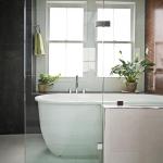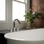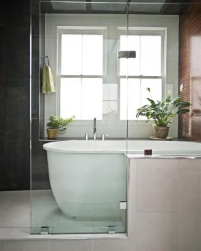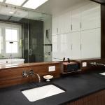 Clever design details give this remodeled master bath a calm, open feeling. The bathtub is in its own, distinct area, yet the glass partition exposes it to the rest of the room and lets the light from the windows travel through the rest of the space, reflected by the wall of mirrors above the bathroom sinks. A long, continuous slate countertop houses twin sinks with plenty of space between them, punctuated by a built-in shelf made to hold an iPod dock. Walnut cabinetry and paneling plus top-notch plumbing fixtures add a sense of luxury, making this spa-like bathroom exactly what the owners wanted: A retreat from their hectic lives, and the perfect peaceful place to start and end the day.