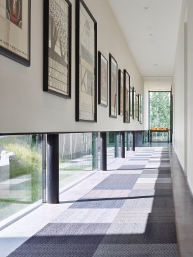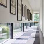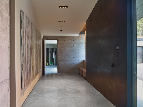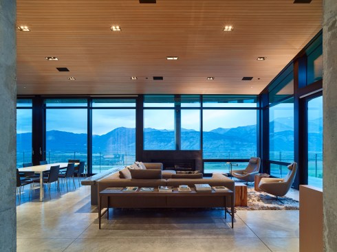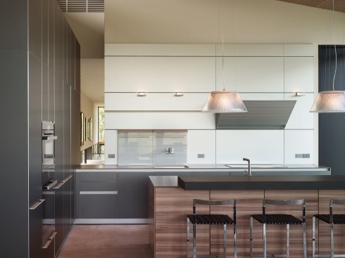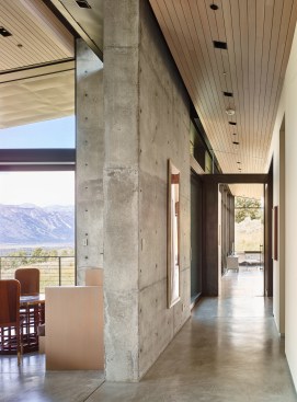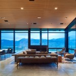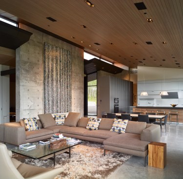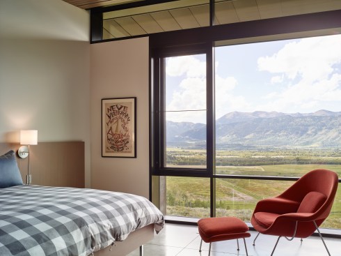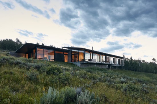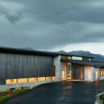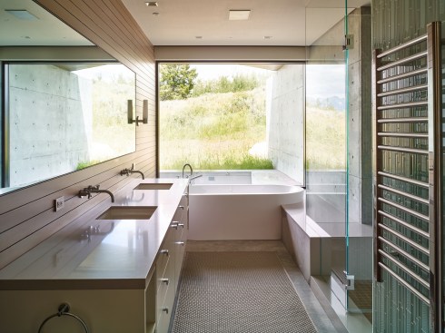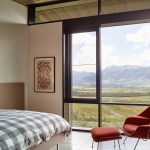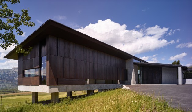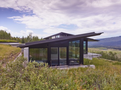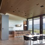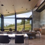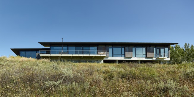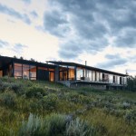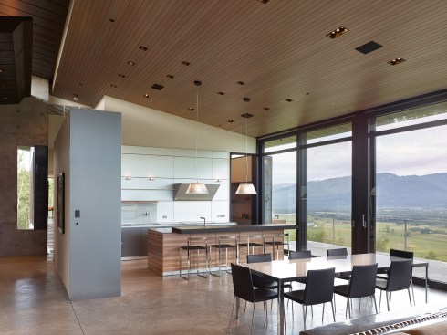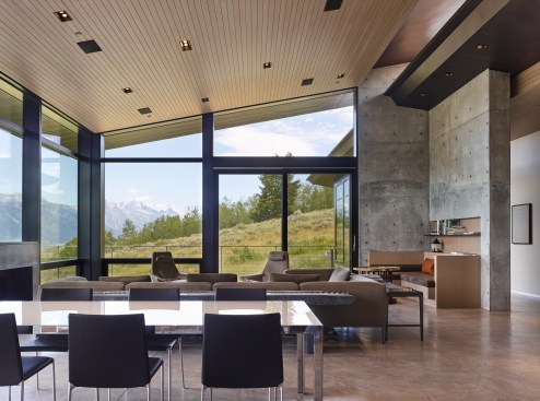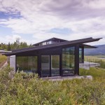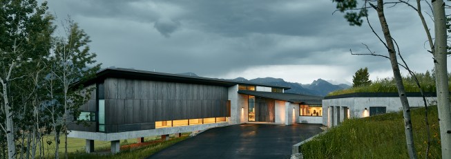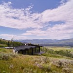 Echoing the grandeur of the Teton Mountain Range whilst seamlessly inhabiting the adjacent grassland, the Wyoming Residence exhibits a conscientious marriage of form and material. The primary ambition for this project was to craft a maintenance-free vacation home that respects the natural habitat. The property’s zoning restrictions were artfully managed with careful assimilation into the natural landscape. The result is an inspired expression of fluid yet layered space that collaborates with the surrounding beauty. With respect to the sloping meadow on which the structure sits, the home is designed to coexist and therefore never breaks the ridge line. The structure manages to feel stately and striking at the entrance, but is hidden from view looking down the meadow and up from the valley floor. To maintain the natural grade, the structure is elevated and cantilevered at the slope and is held up by columns which require minimal site alteration. The only major land disturbance occurs in the recessed garage, which has been supplemented with a green roof on top to preserve the meadow. Once inside, natural light serves as an important material layered amongst its solid counterparts. Floor-to-ceiling windows unveil a view of the stunning exterior scenery. Wood ceilings add warmth and dimension, creating expansiveness by sitting slightly detached from the adjoining walls. The living area is voluminous yet intimate. A built-in seating nook maintains a direct view of the mountains, unobstructed by a low profile fireplace. The minimal kitchen design is apportioned with tri-colored cabinets and a clever opening through that overlooks the gallery. The master bedroom shares in the floor-to-ceiling views, allowing symbiosis with the meadow outside. An indoor-outdoor bathroom further incorporates the exterior habitat. The home features four bedrooms, four and one half bathrooms, a living room, kitchen, home office and studio, den, mudroom and a three-car garage.