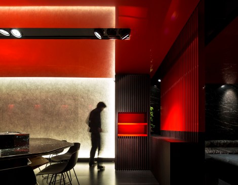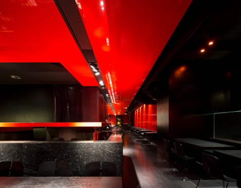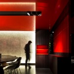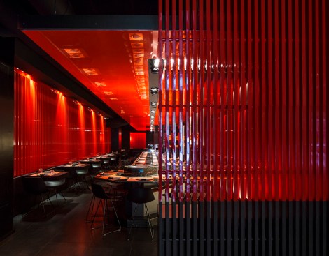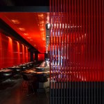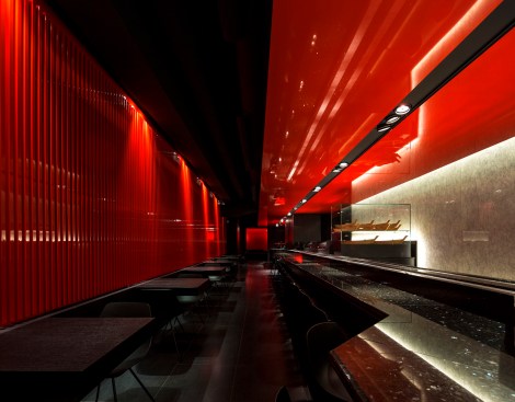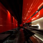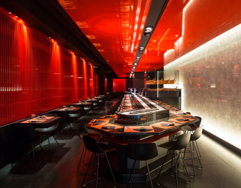 The dynamism of the kaiten suggests to emphasize the dynamic dimension of the space. The project, conceived with the Kyoto walkways in mind, is thought as a process, a succession of steps and changes of direction that gradually reveal the spaces of the restaurant and never close the perspective. To each change of direction corresponds a subsequent opening that invites to continue exploring the space. The straight lines of the suspended ceilings and the infinite sequence of the vertical elements of the walls underline this dynamic. Red orange reflecting suspended ceilings emphasize the visual perspectives and identify the different areas of the hall, the sushi bar and a small more intimate room in the bottom, dividers and wall coverings formed by the close succession of thousand of vertical black timber elements, lacquered from one meter up of glossy red-orange, drive and mark the going through, while a rice paper backlit wall underlines the central focus of the restaurant, the Kaiten and the open workstation of the sushi master. All the space is conceived as an architectural promenade rather than a simple decor of the interior.
