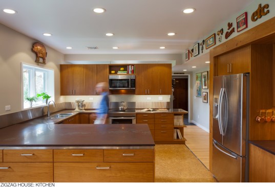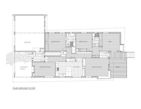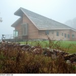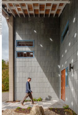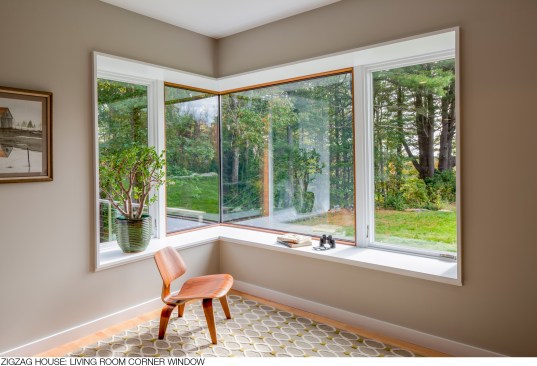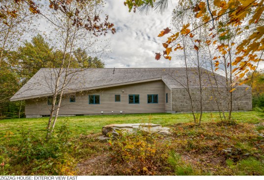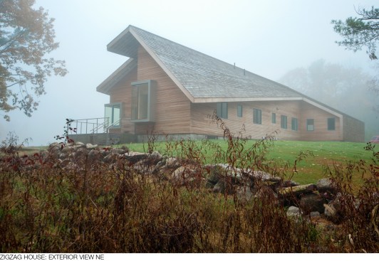 A single story home for a retired couple, the Zigzag House is organized around the notion of a path meandering through a landscape. A two-story covered entry garden forms an exterior room which initiates this path through the house as continuous with the outside landscape. Openings in the roof allow patches of light to track across the ground, up the slate-covered walls, and into the rafters of this outdoor room. Thus this meandering path is initiated within a space of circadian movement drawn into the volume of the house. Within the interior of the home, the path forms a crooked spine which bends around a series of materially discreet objects as one moves through the social spaces in the southern part of the home. This bending promenade is further punctuated by a series of interior apertures that frame oblique views across the space of the house and into the landscape beyond. At the back of the home, large corner window boxes project beyond the exterior envelope of the house, forming threshold spaces which draw panoramic views of the gently sloping field and forest into the living spaces of the home. Sitting in these window boxes, one occupies a space between inside and outside. A raised exterior deck extends toward the forest between these two large windows, and slate steps lead down to the ground and direct one toward a break in the stone wall and the forest beyond. The Zigzag House postulates inhabitation as a form of passage across the land, producing a dynamic form within the landscape and an interior space that is simple yet intricate and inextricable from its site.