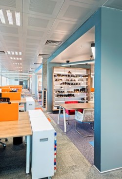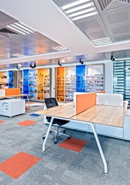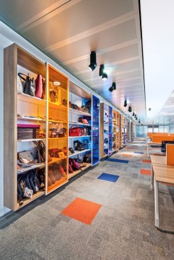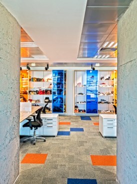 In Ziylan General Management Office where all design departments were fictionalized together, one of the important aspect effecting the organization of the place was their storage type. In the working units where hundreds of shoes were examined, developed and having a quite fast circulation, aesthetic solutions were developed by CBTE Architecture, as an alternative to close store system, sliding gate colorful cupboards designed both for keeping the shoes open and providing a quality exhibition, aimed to direct the perception towards the intensity inside to itself and differentiate the place. With the colors in the carpets used at office, the visual connection and functional perception between the cells of design units and store units were provided.