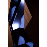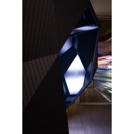 This obstinate obsidian mass carries an indexical register of its subtractive formal genesis within its ornament and poché. It shows its work. Beginning with a series of cubes rotated on their diagonal axis (30°, 60°, 90°), and obedient to the resultant series of internal cleavage planes, the design process involved the trimming of the textured, the eccentric, the difficult. Its interior surface illustrates the final extracted phase, while its exterior surface results from an intermediate step in the process. The embedded line work of the exterior surface reveals a still-earlier stage, its idiosyncratic geometries projected onto the intermediate object as a series of topographical contours.