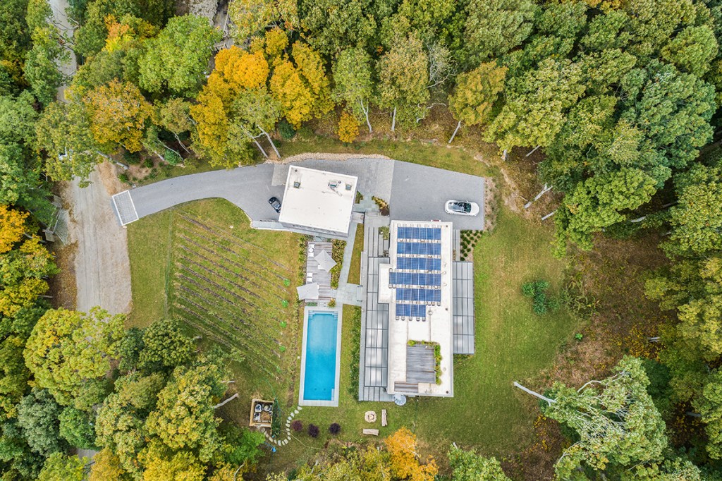 Located off the coast of the Peconic River near Long Island, N.Y., this 4,105-square-foot house is built out of concrete, the façade articulated by design to create a pattern, but mostly used for rapidity of construction, durability, and ease of upkeep. The upper portion of the pool house is cladded with horizontal cedar siding boards of variable widths and depths—a salute to the local building vernacular used on Shelter Island, which is accessible only by ferry. The house is intended to minimize its carbon footprint by providing solar electricity for heating and cooling and other usages, in addition to employing ultra-efficient means of construction to maximize conservation. A vegetable garden surrounds the deck adjacent to solar panels. The electricity generated by the sun keeps the house warm via the radiant floor heating system during colder months and charges the family’s electric cars.