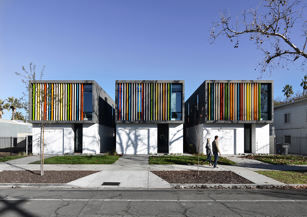 Oak Park Housing in Sacramento, Calif., is a 2019 AIA award-winning residential project from Milwaukee-based architecture firm Johnsen Schmaling Architects. The project, which won honors in the one- and two-family production homes category, features a cluster of six 1,503-square-foot single-family homes that serves as a proof-case in infill acupuncture. “Carefully proportioned to echo the massing and scale of the area’s existing building stock, the houses are simple, two-story volumes. Their appearance is crisp but deliberately playful, in a nod to the progressive spirit permeating the neighborhood. The buildings’ south façades transform into an articulated field of vertical metal louvers that act as both sunscreen and compositional device. The metered spacing of the louvers sets up a dynamic cadence, their prismatic colors complementing the homes’ otherwise neutral, muted tones and cheerfully reverberating the vivid, kaleidoscopic hues of the buildings and murals nearby.”