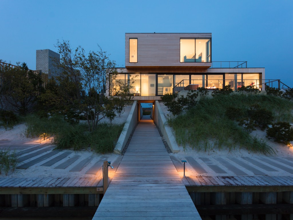 The RAAD Studio Beach House is a 2,400-square-foot, Alaskan yellow cedar-clad “forever” home in Sea Bright, N.J., a coastal town Superstorm Sandy clobbered in 2012. The home’s structure is made—amid local maritime-style crafted ipe decking—of two stacked volumes that sit atop the sand dune, almost 15 feet above sea level. A boardwalk between concrete retaining walls runs underneath, serving as a storm canal should seas rise. Architects call this home a “marriage of landscape and architecture.” They note that innovation in residential architecture is a form of personal agency, a way for work to do something to improve people and the world.